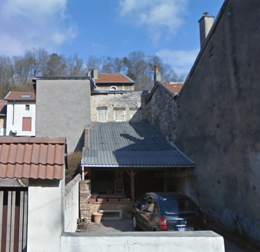 ‘Ja, het huis heeft zeker originele details’ zegt Robin als ik vraag naar zijn mening. ‘Het is niet groot. Meer hoog, en echt heel smal. Hooguit 4 meter of zo. Beneden loopt van voor naar achter een lange smalle gang. Je kunt achter naar een kleine court (ommuurd binnenplaatsje), met wat planten en een oud toilethokje. Ja, het is groot genoeg voor een bistro-setje. De muur tegenover je is de ‘remise’, een soort schuur. Die hoort er ook bij vertelde de dochter en de begane grond gebruikte haar moeder als een soort opslag of bijkeuken. Je kunt met een houten trap naar boven, dan kom je op de verdieping en daarna is er een zolder. Daar zitten de drie dichtgemetselde raampjes aan de achterkant, die we al eerder op streetview hadden gezien. Aan de kant van de binnenplaats zitten twee kleine ramen, zonder ruiten.’